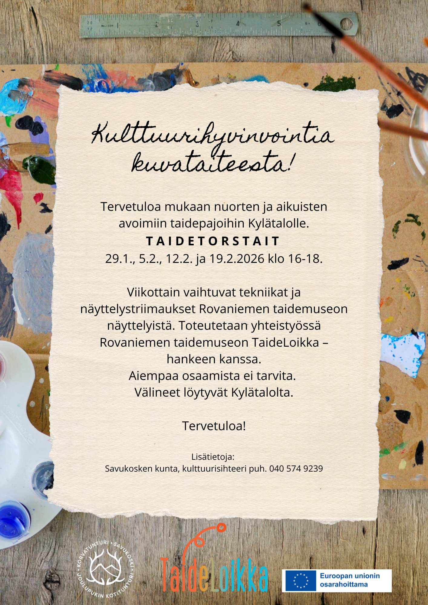 Tervetuloa mukaan nuorten ja aikuisten avoimiin torstain taidepajoihin Kylätalolle to 29.1., 5.2., 12.2. ja 19.2.2026 klo 16-18. Viikottain vaihtuvat tekniikat ja näyttelystriimaukset Rovaniemen taidemuseon näyttelyistä. Toteutetaan yhteistyössä Rovaniemen taidemuseon TaideLoikka – hankeen kanssa. Aiempaa osaamista ei tarvita. Välineet löytyvät Kylätalolta.